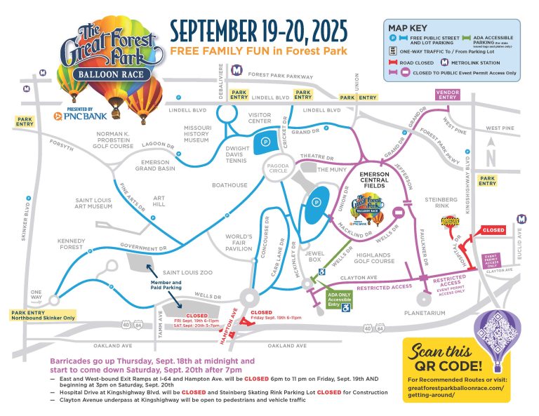 The Great Forest Park Balloon Race presented by PNC Bank is a free event and free street and public lot parking is available throughout Forest Park all weekend. Pease keep in mind spots are limited so we suggest you plan ahead and arrive as early as you can. All of the notes and restrictions/closures listed below will be in effect to help with safety, traffic flow and ease of access to Forest Park.