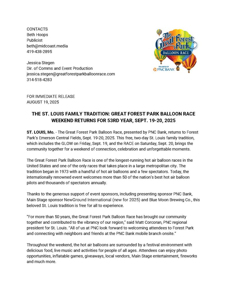 GFPBR welcomes and works with members of the media from all media platforms including broadcast, print, photographer and digital media. To qualify for media credentials you must be a member of the media (traditional or digital), meaning the work you produce at The Great Forest Park Balloon Race must be developed to be shared with a larger audience, on a qualifying media platform.